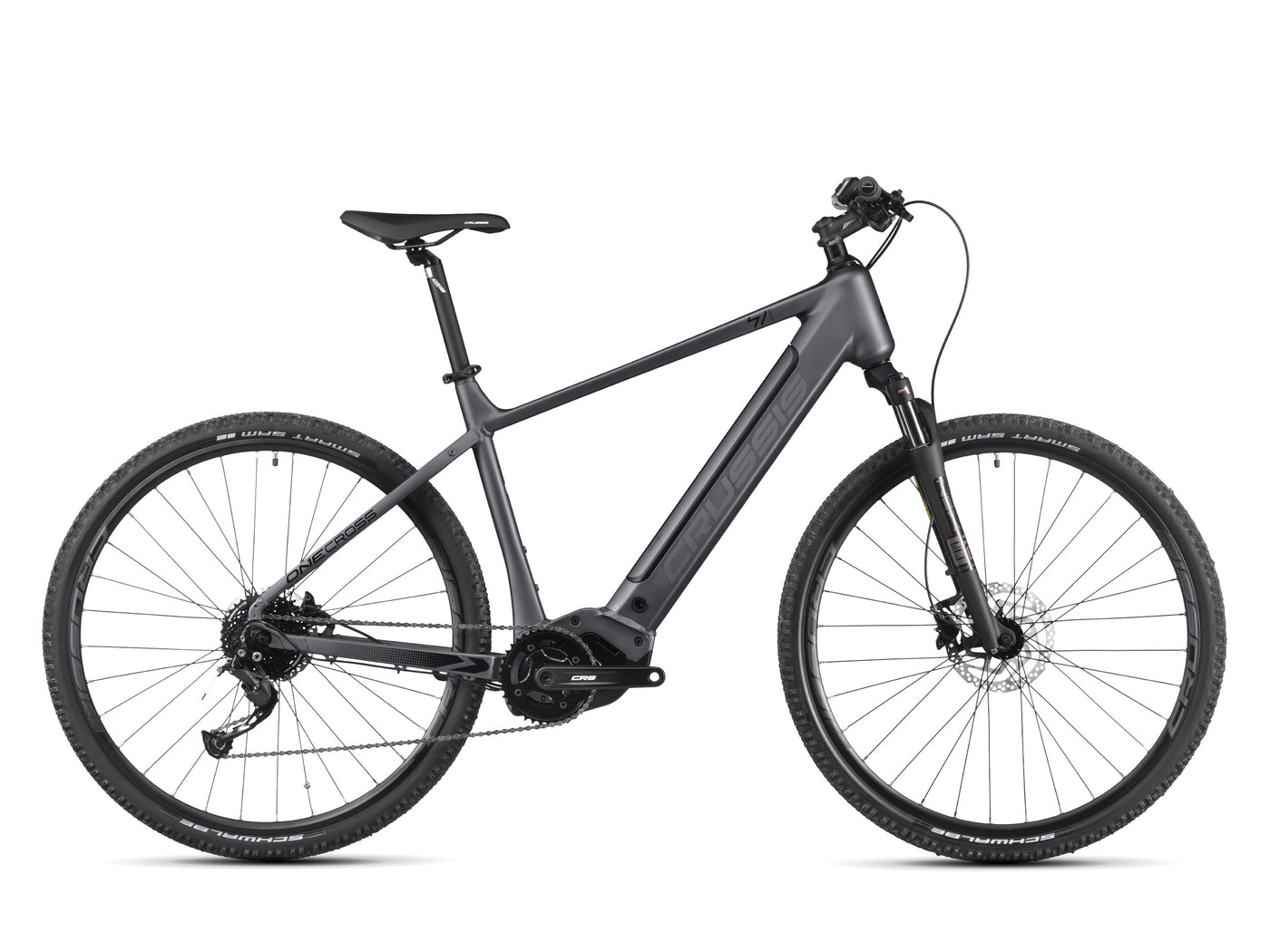 Elektrokolo ONE-Cross 7.10-(720 Wh) je vybaveno vidlicí SUNTOUR NEX HLO DS 700c pro pohodlnou jízdu a barevným LCD displejem PANASONIC, který zobrazuje všechny klíčové údaje o vaší jízdě. Jednoduchý černo-šedý design dodává tomuto modelu styl, který si zamilujete na každém vašem dobrodružství.